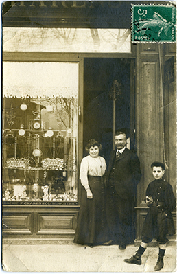 Pour subsister ma tante ouvrit près de l'église un atelier de couture. Mon père s'occupait beaucoup de son neveu et songeait sans doute à lui faire apprendre le métier d'horloger et en faire son ouvrier. Mais ma tante ayant fait quelques économies elle préféra aller monter une épicerie rue Madier-de-Montjau à Valence. Elle considérait comme une promotion sociale ce passage d'une petite ville à une plus importante et de l'artisanat au commerce. Elle et son fils manifestèrent une grande activité mais une totale ignorance du commerce, si bien que le magasin périclita. Mon père dut faire, souvent en ma compagnie, de nombreux voyages à Valence pour éviter que ma tante soit en faillite. Mon père y laissa des plumes mais obtint de sa soeur qu'elle reprit le métier de couturière. Quant à mon cousin il devint apprenti pâtissier. Mobilisé en 1912 il le resta pendant six ans et fit toute la guerre dans l'infanterie. A Romans où il était en garnison il avait fait la connaissance d'une jeune fille, Mado, qu'il épousa à sa démobilisation.