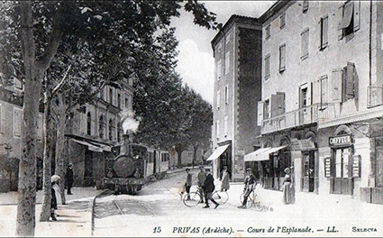 A partir de 1912 elle fut remplacée par ce qu'on appelait le "tram" et qui était un petit chemin de fer réunissant la voie ferrée du Pouzin à celle de St Paul le Jeune. Bien que la voie quitta la route quand la pente était trop forte et qu'un tunnel fut même creusé sous le col de l'Escrinet, les locomotives poussives avaient bien du mal à traîner les wagons brinquebalants. Maintes fois j'ai vu patiner leurs roues devant le magasin (les tram passait le long de l'Esplanade de Privas) et elles devaient faire machine arrière pour reprendre leur élan. Ce tram était si lent et me donnait tellement mal au coeur que je pris le parti de me rendre à Vesseaux à pied en coupant directement à flanc de montagne à partir de l'Escrinet.